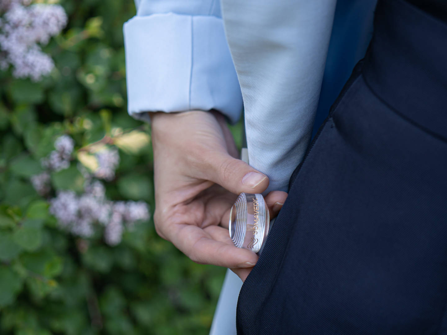 Tiny is designed to absorb some of your Somavedic device’s energy to carry in your pocket outside of the home. The effect of the charged Tiny lasts about 8 hours from an overnight charge and has a distance of a few feet in all directions. You need to have a Somavedic device to take advantage of the Tiny. We recommend charging it with Somavedic Vedic, Anthracite, Rosalin, Traveller, Amber and Gold models.